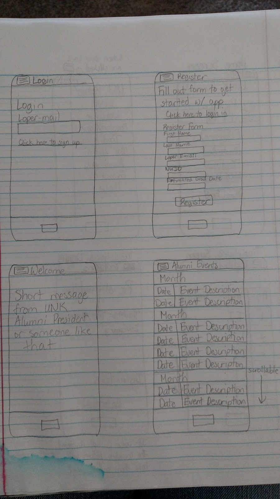 For the database part of the app, I created a table for the user which will hold the user's NUID, first name, last name, Loper email, and estimated date of graduation. There is also a table for holding the traditions for the app, and the fields in that table are the tradition number, tradition name or title, tradition description, and the tradition instructions for how to complete it. There is also a table that joins the student and tradition tables, and it has the student's NUID, the tradition number, the date the tradition was completed, and the photo that the student took. We might include some sort of calendar in the app, so I also have a table that will hold upcoming alumni events that the users could go to, since the app is for UNK's alumni association. Another table is for the number of traditions that a student has completed. We are not sure exactly what prize a students would get for completing a certain amount of traditions, but this table would keep track of what type of prize the student would receive and how many traditions would have to be completed first. The there would be another adjoining table between this one and the student table with the student's NUID, the number of traditions that was completed to get to this step, and the date that that level was reached.